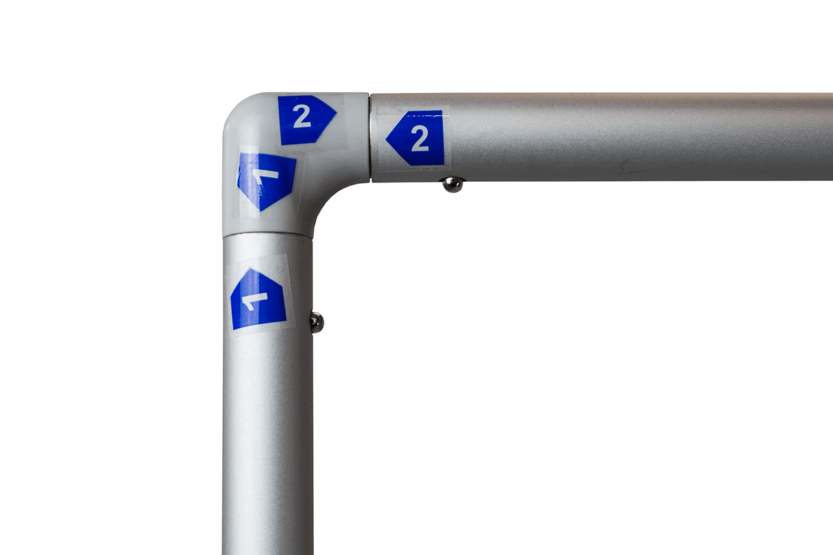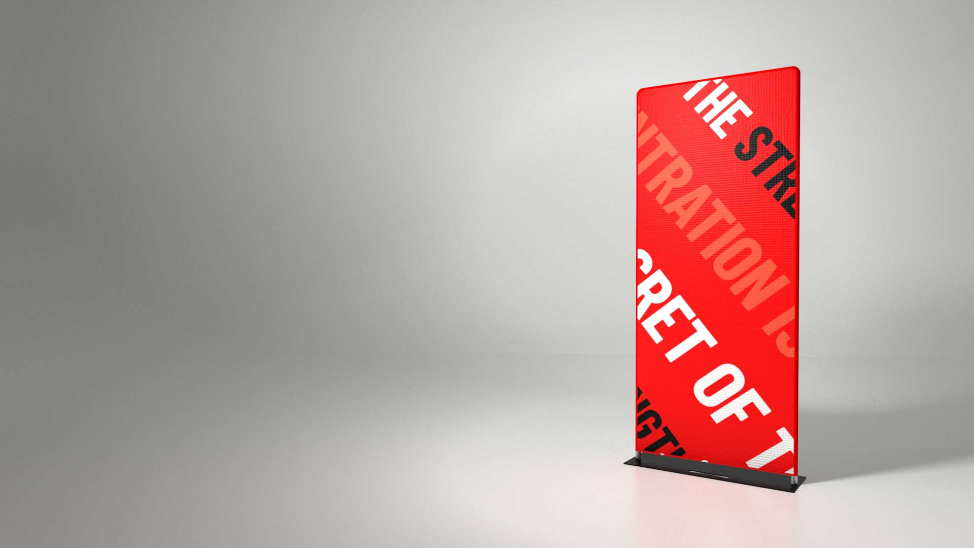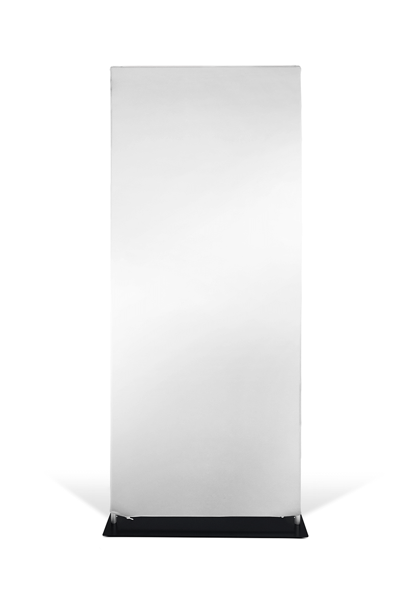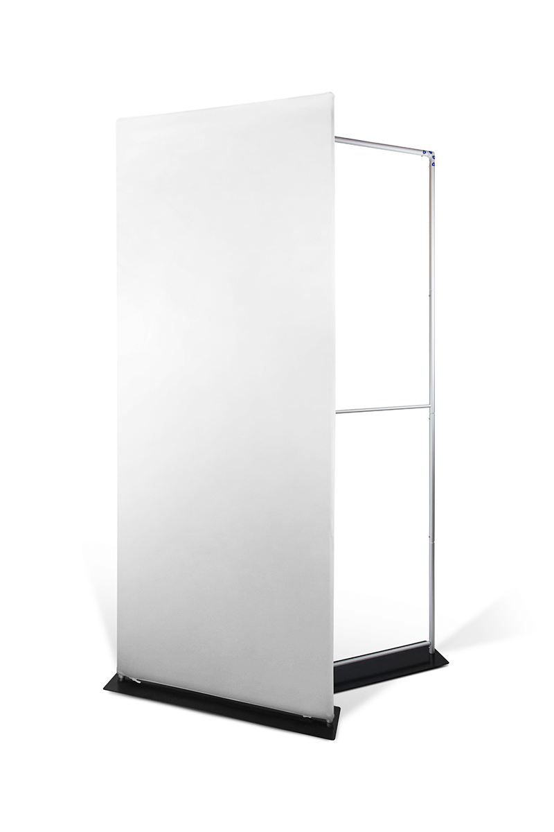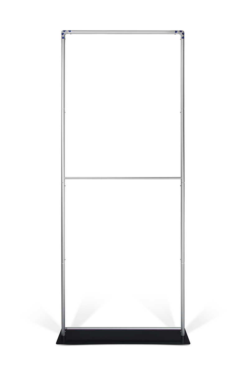 , designed to present graphics in a clean, elegant and professional way. The textile graphic is stretched over the structure and closed with a , ensuring quick, intuitive and tool-free assembly. A key feature of this system is the , which provides outstanding stability and secure positioning even in high-traffic environments. The lightweight aluminium frame combined with the solid steel base results in a durable and visually appealing display ideal for trade fairs, presentations and point-of-sale installations. After use, the structure can be disassembled efficiently and stored in the is an excellent choice for users who need a stable, modern and easy-to-assemble textile display system that offers an elegant presentation and superior stability thanks to its steel base.