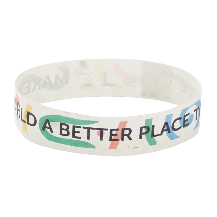 Pflanztechnologie: Das Armband besteht aus 80 g/m² Papier, in das eine Mischung aus Wildblumensamen eingearbeitet ist. Nach der Veranstaltung kann es in Erde gepflanzt werden, um Blumen wachsen zu lassen.
