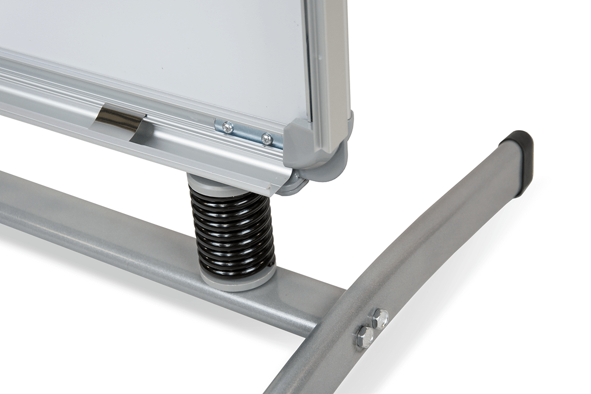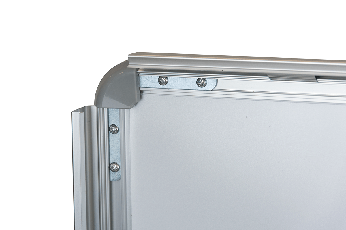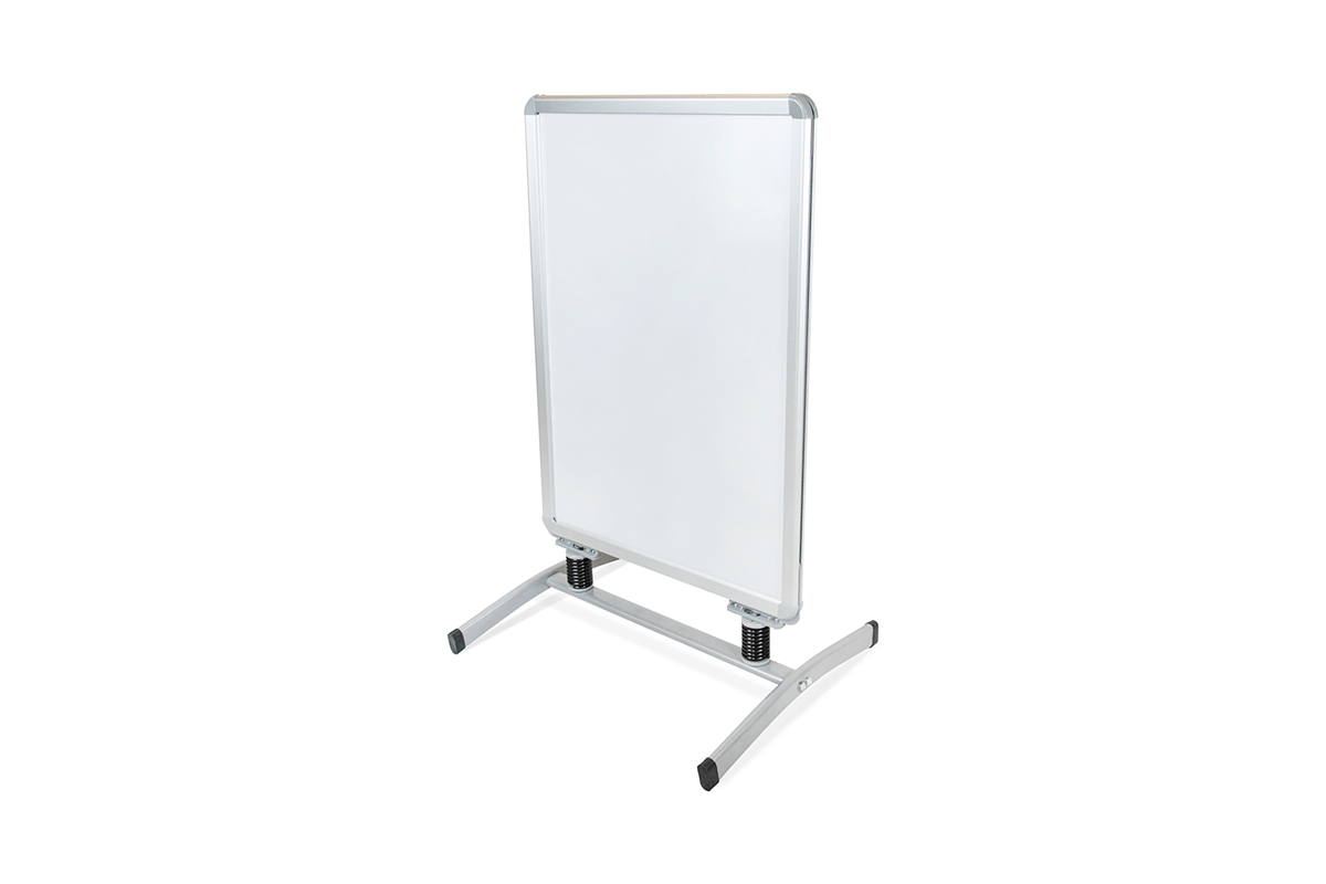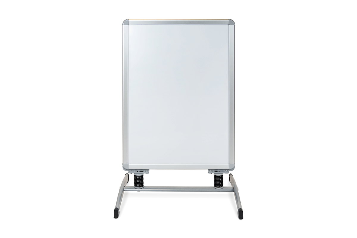 The Ironbase Snap Frame A-board is a durable and refined solution for displaying posters in both outdoor and indoor settings. It features a double-sided silver anodised aluminium snap frame (32 mm profile) mounted on flexible springs for improved wind resistance. The wide-set legs ensure excellent stability, even in challenging conditions. Matte protective covers safeguard posters from glare and dirt.