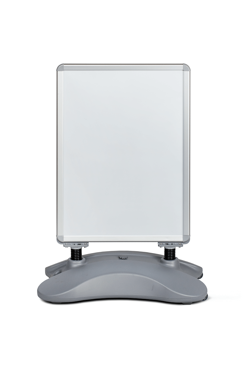 The Snap Frame A-board Waterbase is a durable and practical solution for outdoor poster display. The double-sided silver anodised aluminium frame (32 mm profile) allows quick and easy poster changes with its snap-open system. Its heavy water- or sand-fillable base provides excellent stability in windy conditions. Flexible springs between the frame and the base absorb gusts and reduce the risk of tipping. Matte protective covers shield your posters from glare and dirt. Integrated wheels make transport easy without emptying the base. Perfect for use in front of shops, service points, petrol stations, or during outdoor events.