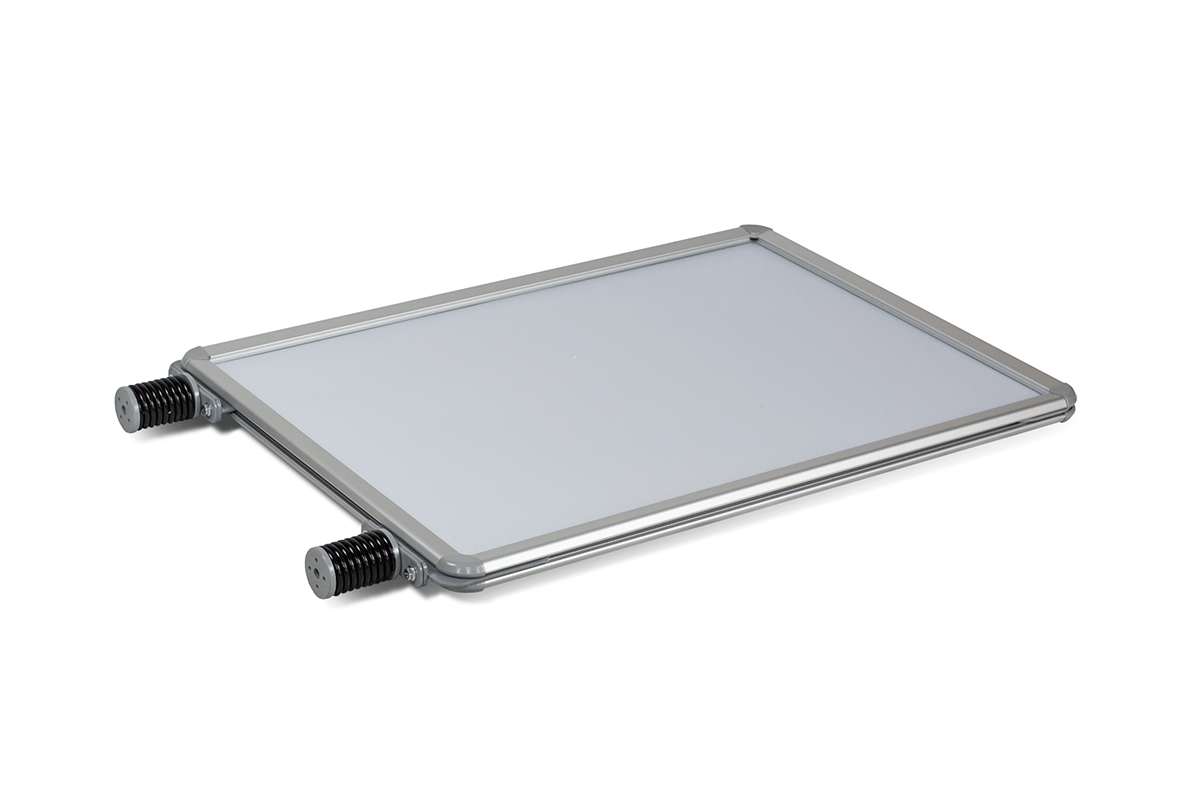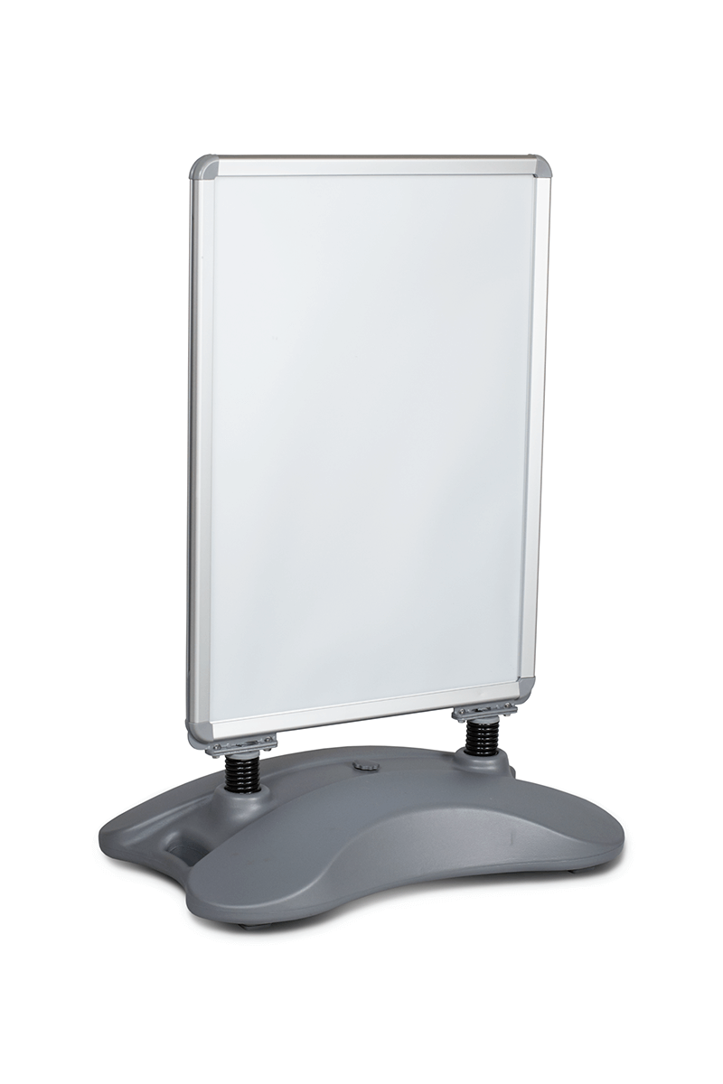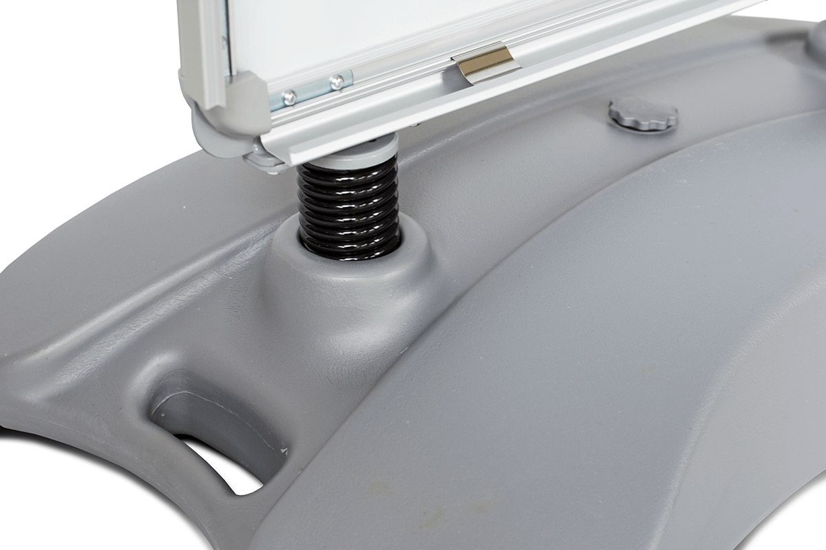 The Snap Frame A-board Waterbase is a durable and practical solution for outdoor poster display. The double-sided silver anodised aluminium frame (32 mm profile) allows quick and easy poster changes with its snap-open system. Its heavy water- or sand-fillable base provides excellent stability in windy conditions. Flexible springs between the frame and the base absorb gusts and reduce the risk of tipping. Matte protective covers shield your posters from glare and dirt. Integrated wheels make transport easy without emptying the base. Perfect for use in front of shops, service points, petrol stations, or during outdoor events.