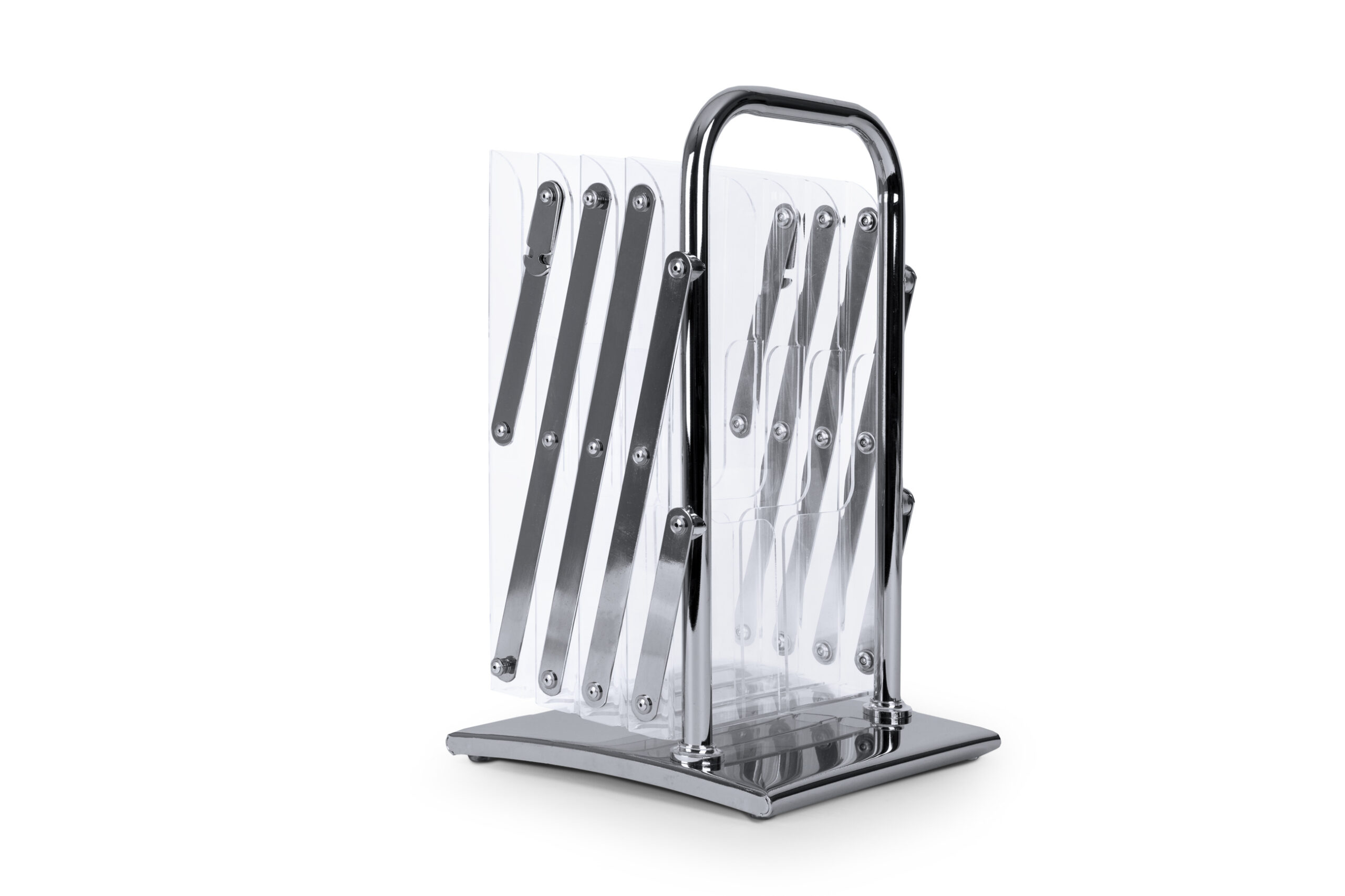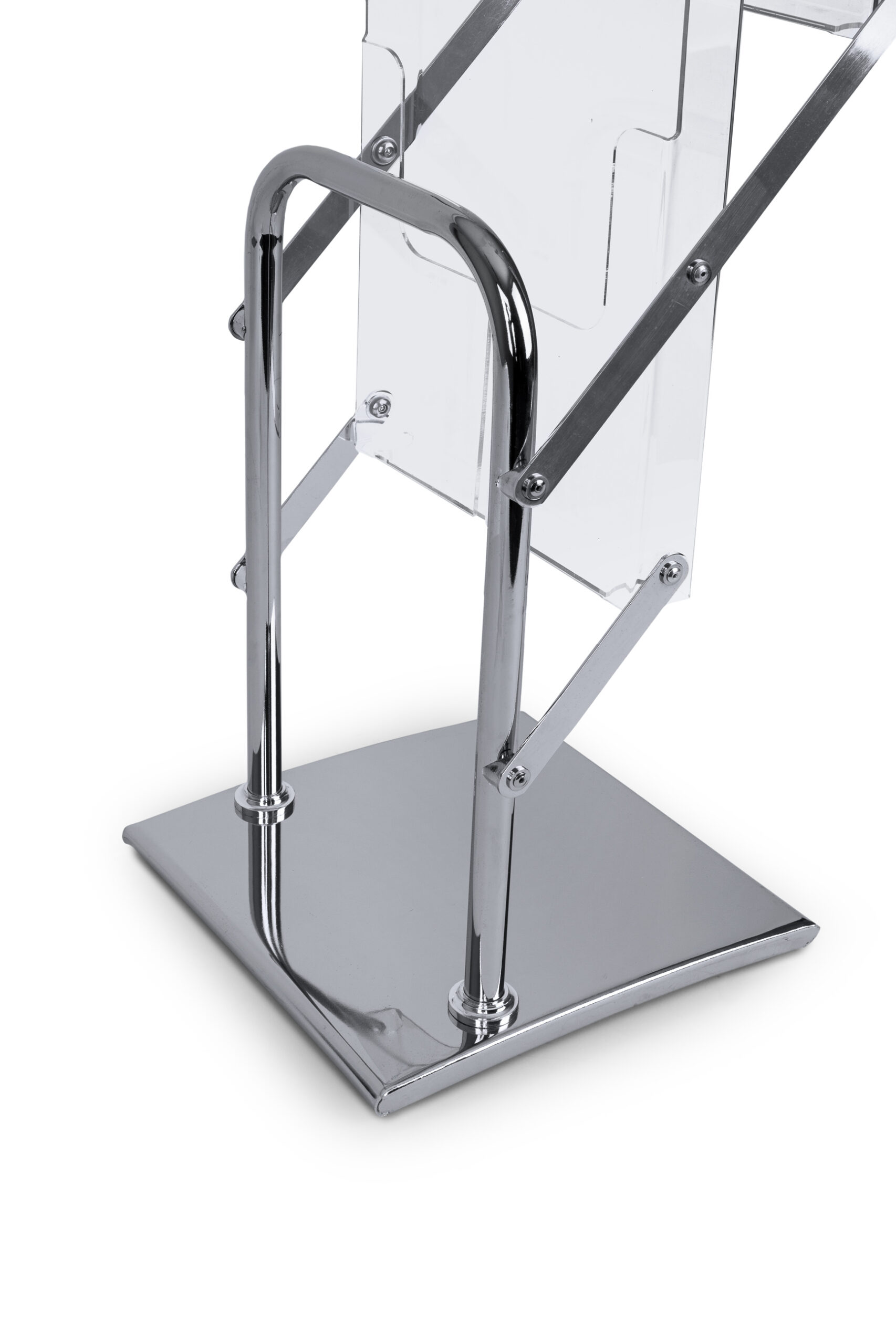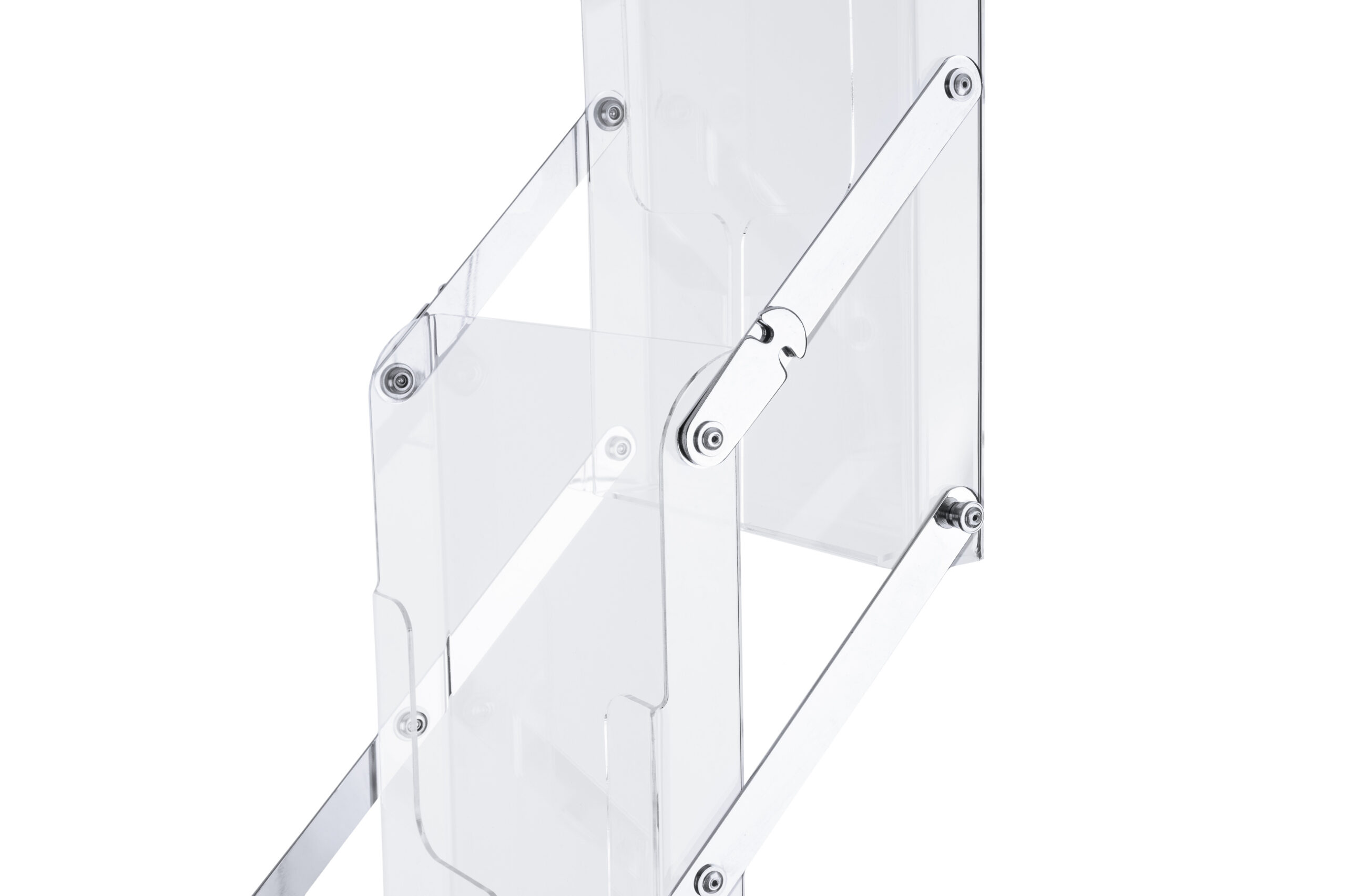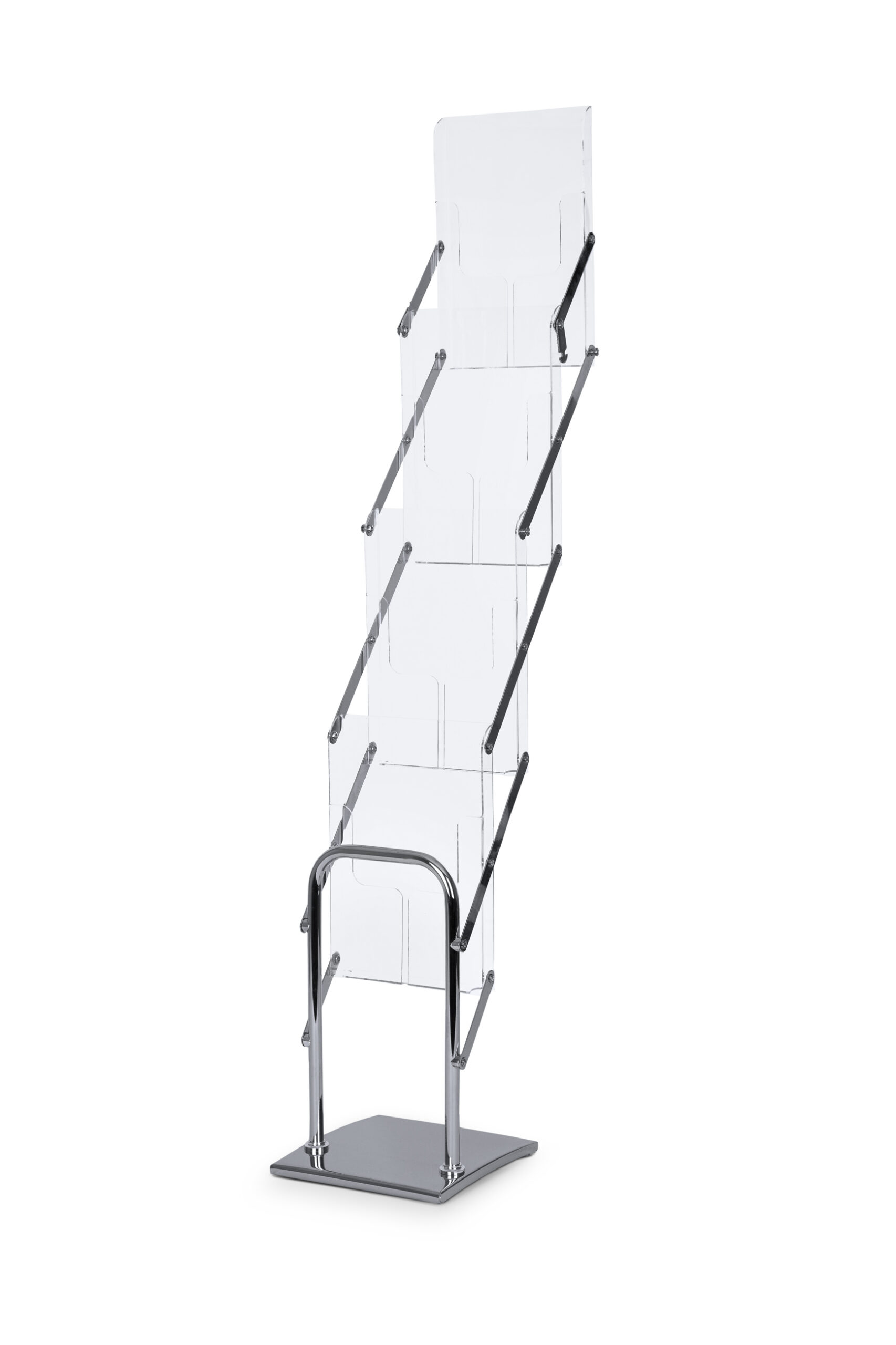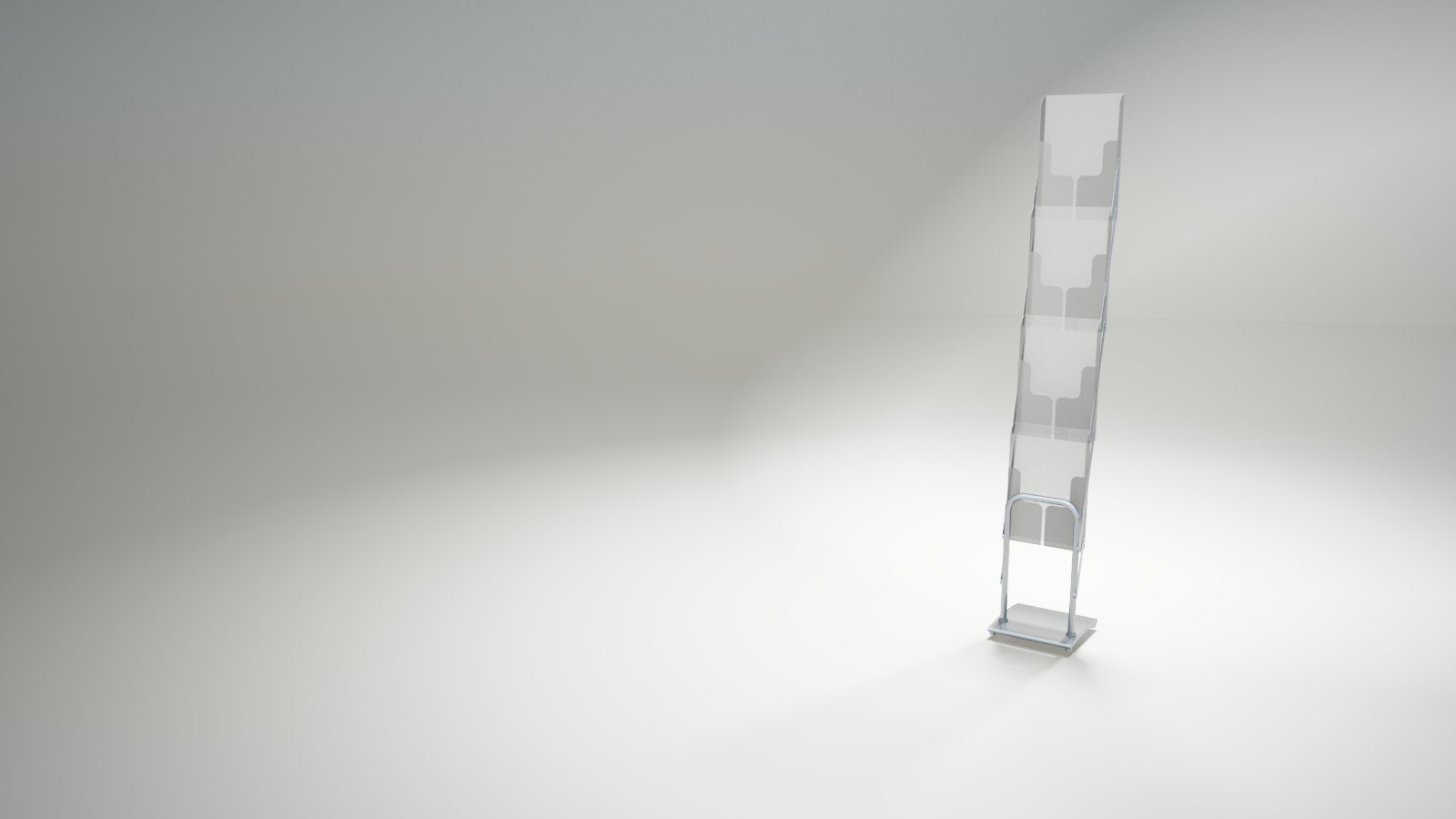 The ALASKA stand is a stylish and modern display solution featuring shelves made entirely from , ensuring an exceptionally clean and attractive presentation of A4 brochures and catalogues. Its structure is supported by a , giving the stand a refined and premium appearance suitable for trade fairs, reception areas, showrooms and retail spaces. Thanks to its folding suunnittelu, the ALASKA stand can be set up within seconds and requires no tools. When folded, it takes up very little space, making it convenient for frequent transport and easy storage during event travel. ALASKA is an excellent choice for users seeking an elegant, lightweight and compact brochure stand that enhances the professional character of any promotional environment.