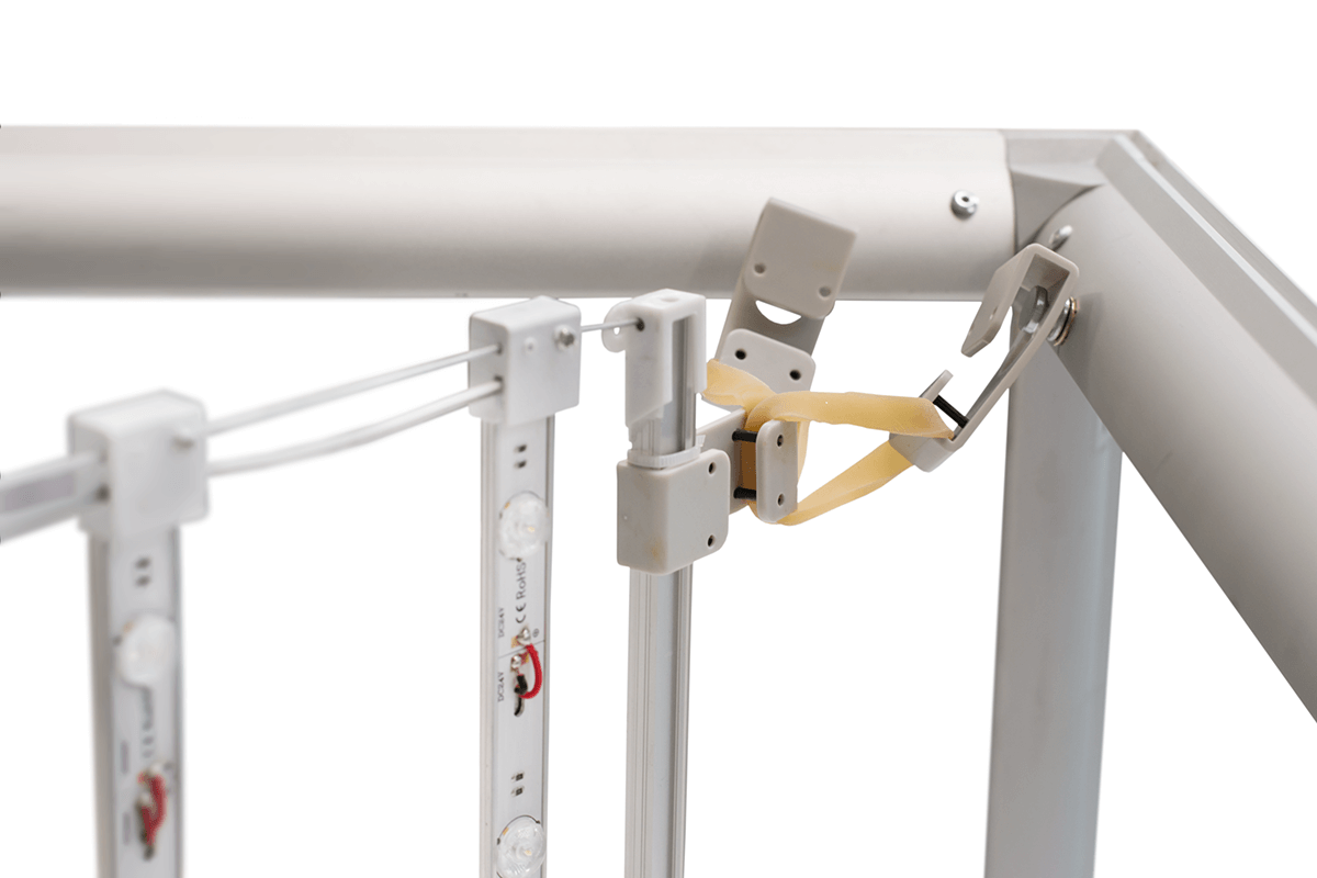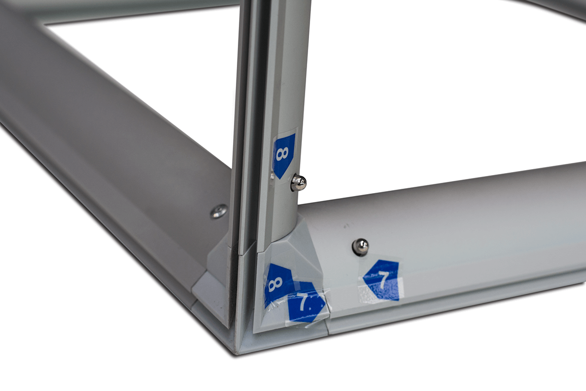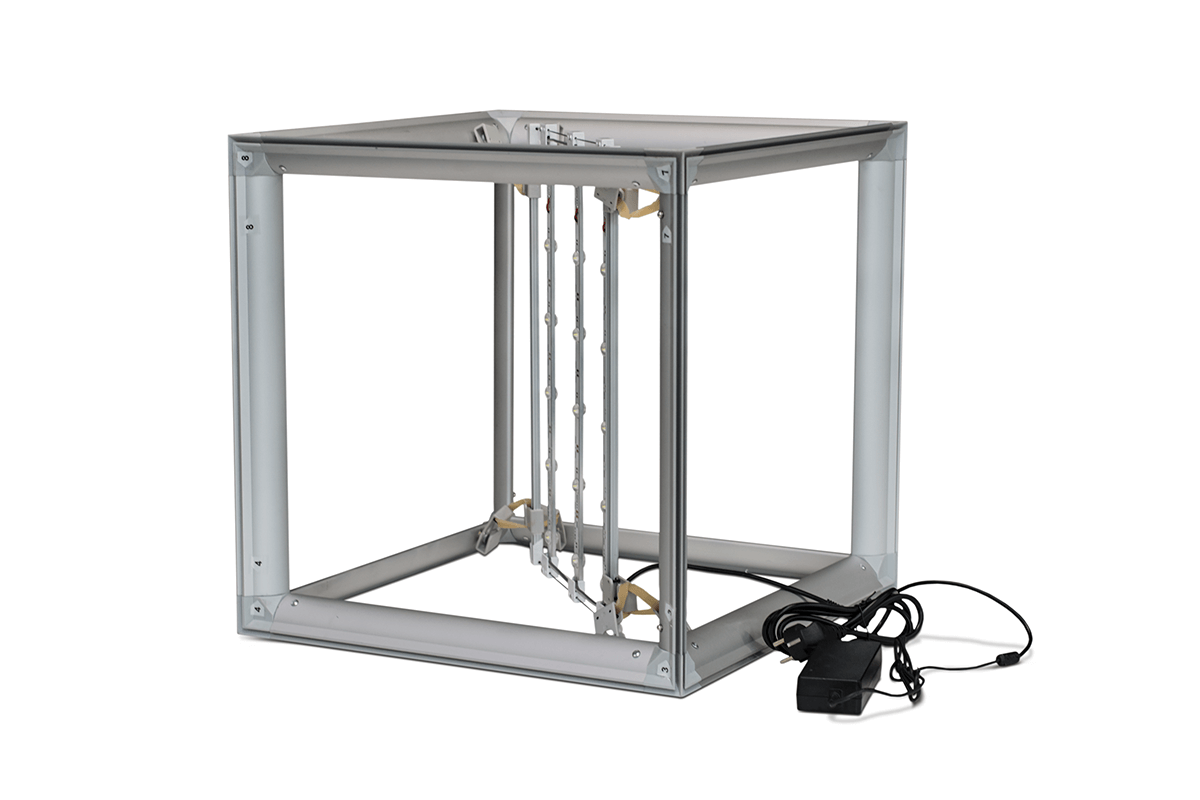 . The evenly lit graphic surfaces provide outstanding brightness, depth and visibility, giving the cube a high-end, eye-catching visual effect ideal for premium exhibition environments. The aluminium frame remains stable yet lightweight, making the structure practical and easy to transport. The silicone-edge textile graphic fits precisely into the frame, creating perfectly smooth, seamless surfaces on all sides. Combined with the LED backlighting, SEG CUBE LED becomes a strong visual highlight for trade fairs, product presentations, reception areas and event spaces. The system allows quick, tool-free assembly, and after the event the components can be conveniently packed into a SEG CUBE LED is the perfect solution for users seeking a striking, illuminated graphic structure that enhances visibility and brings a premium touch to any presentation.