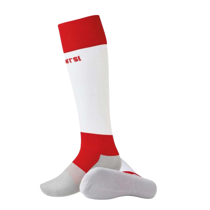 Jalkapallosukat: Pohkeen yli ulottuva pituus, verkkokankaiset paneelit pohkeessa ja pohjallisessa.