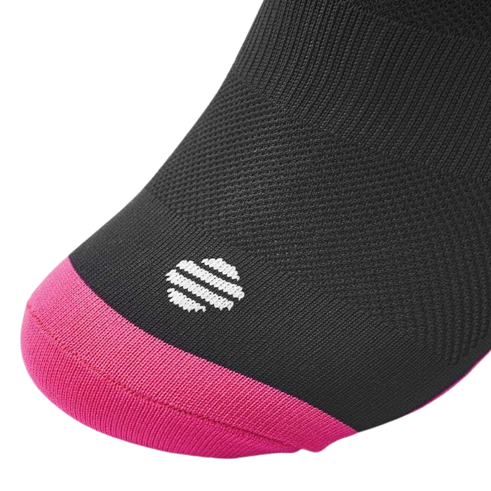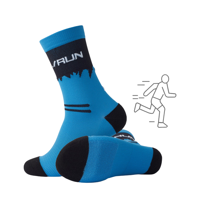 Juoksusukat: Edistyksellinen neulonta hengittävällä verkkomateriaalilla vartalon etuosassa ja pikee-neuloksella lahkeen toisessa päässä.