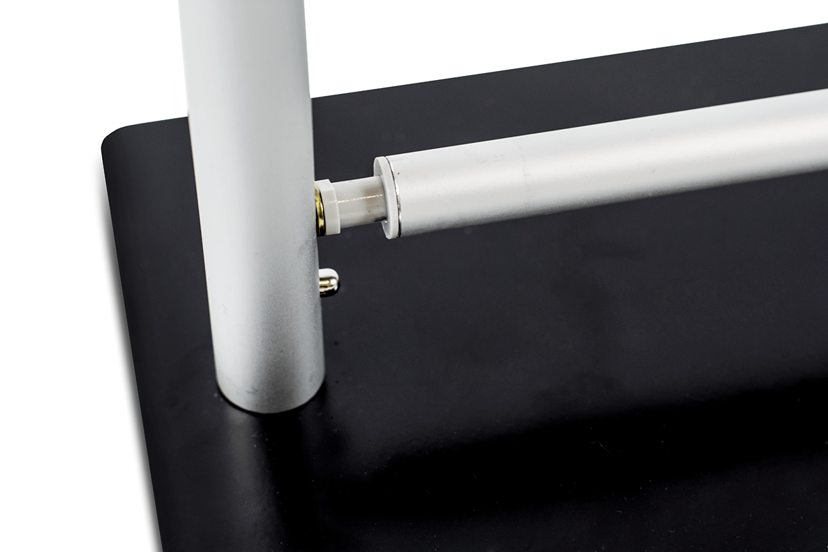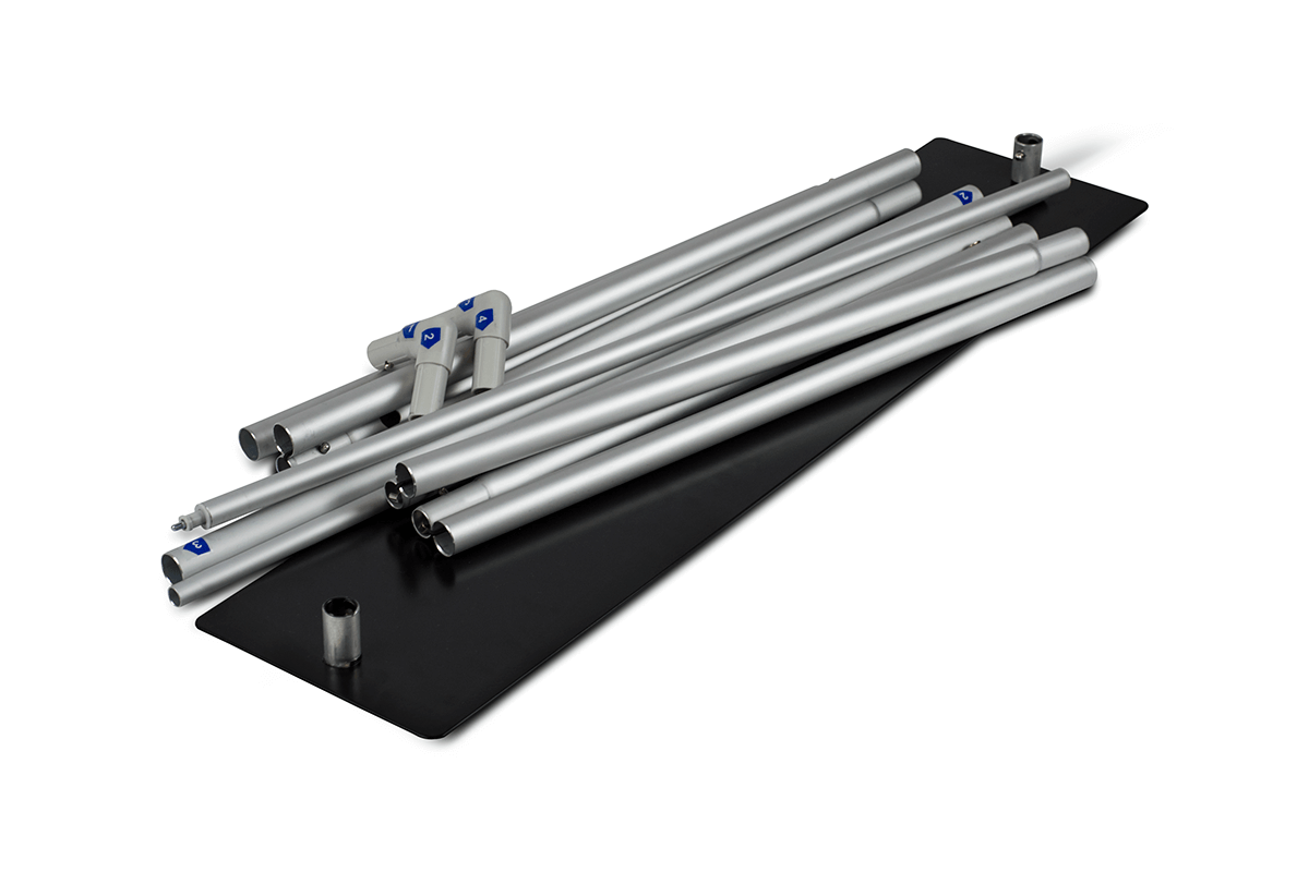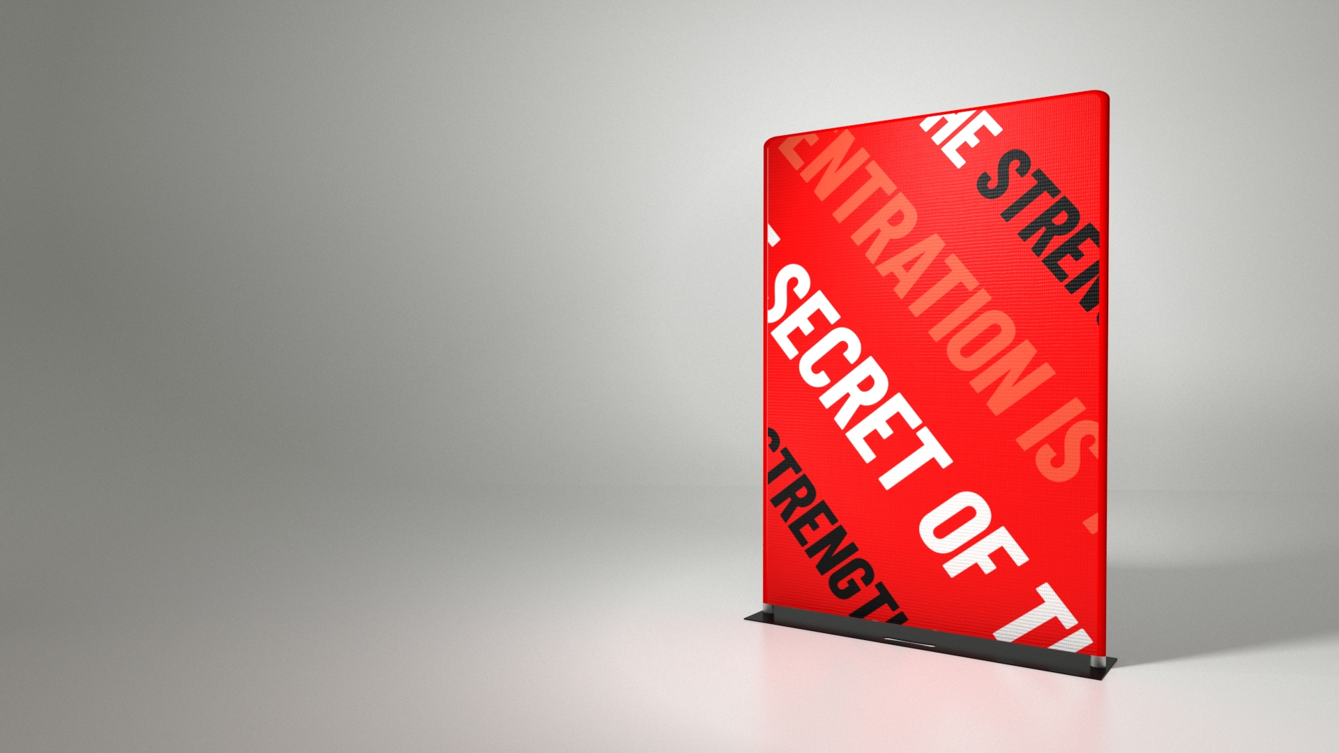 that ensures both lightness and a professional presentation. The textile graphic is stretched over the structure and closed with a , making assembly simple, intuitive and completely tool-free. The structure is supported by After the event, the FABRIC ROLLUP can be disassembled quickly, and all components fit into the The FABRIC ROLLUP is an excellent choice for users seeking a lightweight, mobile and easy-to-assemble system that provides an elegant textile graphic presentation and stable positioning thanks to its stabilising feet.