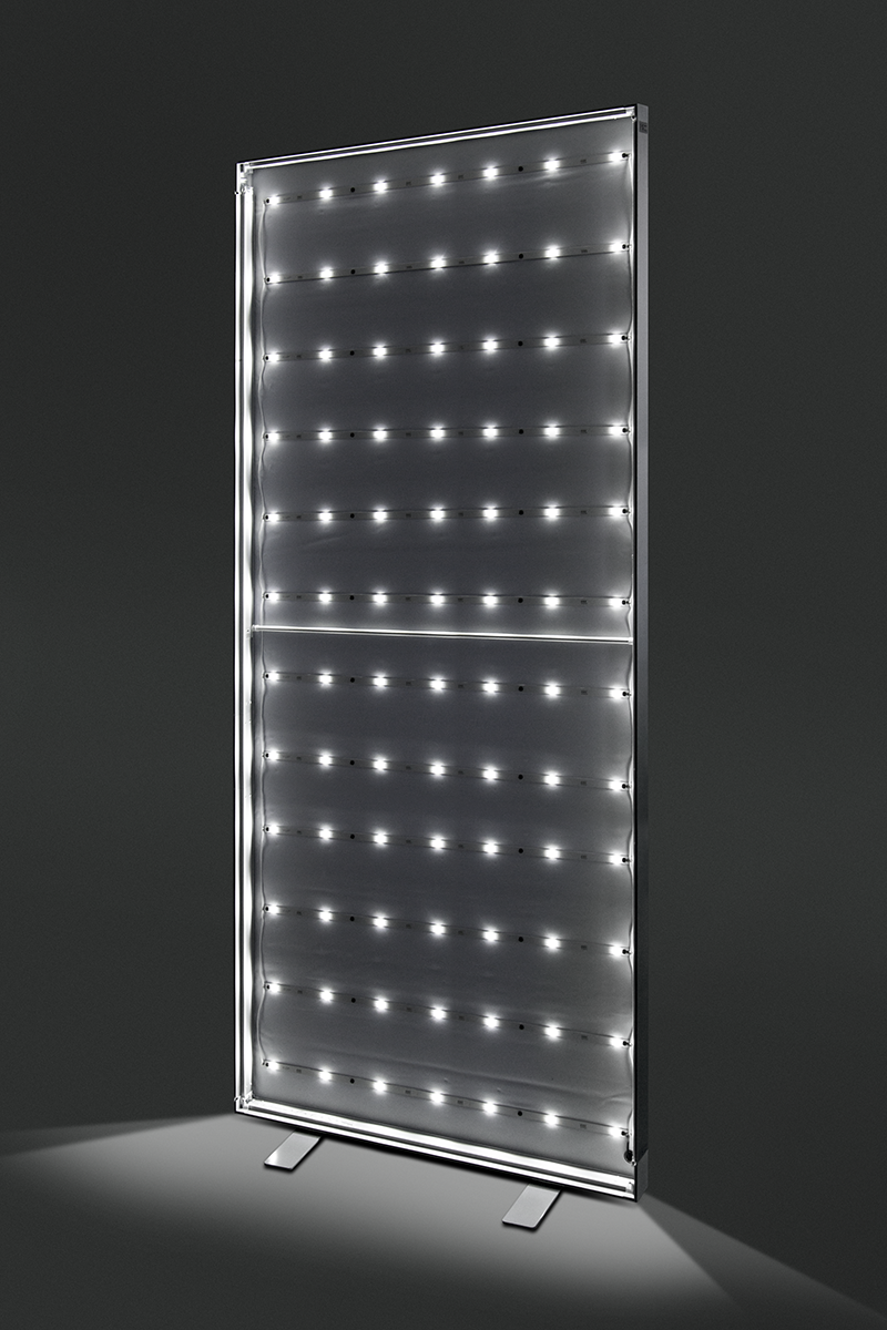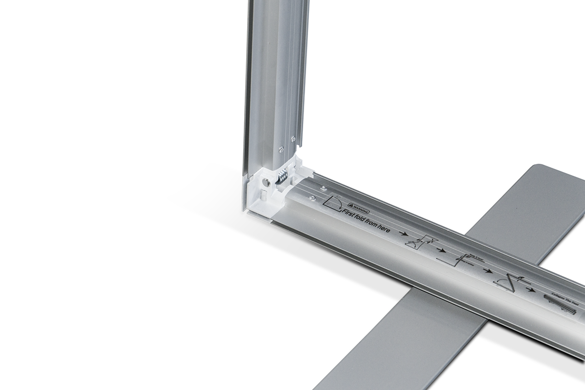 FOLD 70 Lightbox SEG is a modern and functional display solution, идеально suited for trade fairs, events, as well as retail and office environments. Thanks to LED backlighting, the graphic is presented in a highly impactful way, attracting attention and enhancing the visibility of your advertising message. The key advantage of the system is its innovative folding construction, which allows for quick assembly and disassembly without the need for tools. The mechanism, based on hinged connections, enables intuitive setup of the lightbox within seconds, significantly improving installation efficiency, especially during events requiring fast setup. The single-sided model is suunnittelued for graphic display on one side, while the LED backlighting system is positioned on the rear panel of the frame. This solution ensures even illumination of the print and high color intensity while maintaining energy efficiency. The structure is made of aluminum, providing durability and stability while remaining lightweight. The SEG textile graphic with a silicone edge allows for quick installation and perfectly tensioned fabric without visible wrinkles.