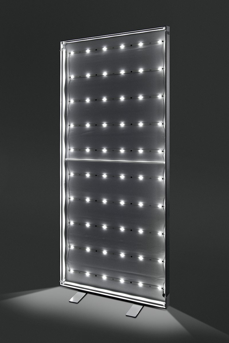 FOLD 70 Lightbox SEG is a modern and functional display solution, идеально suited for trade fairs, events, as well as retail and office environments. Thanks to LED backlighting, the graphic is presented in a highly impactful way, attracting attention and enhancing the visibility of your advertising message. The key advantage of the system is its innovative folding construction, which allows for quick assembly and disassembly without the need for tools. The mechanism, based on hinged connections, enables intuitive setup of the lightbox within seconds, significantly improving installation efficiency, especially during events requiring fast setup. The single-sided model is suunnittelued for graphic display on one side, while the LED backlighting system is positioned on the rear panel of the frame. This solution ensures even illumination of the print and high color intensity while maintaining energy efficiency. The structure is made of aluminum, providing durability and stability while remaining lightweight. The SEG textile graphic with a silicone edge allows for quick installation and perfectly tensioned fabric without visible wrinkles.