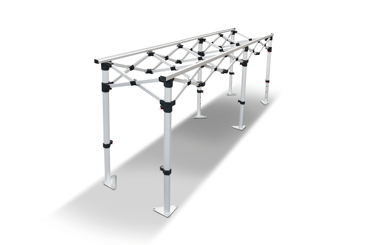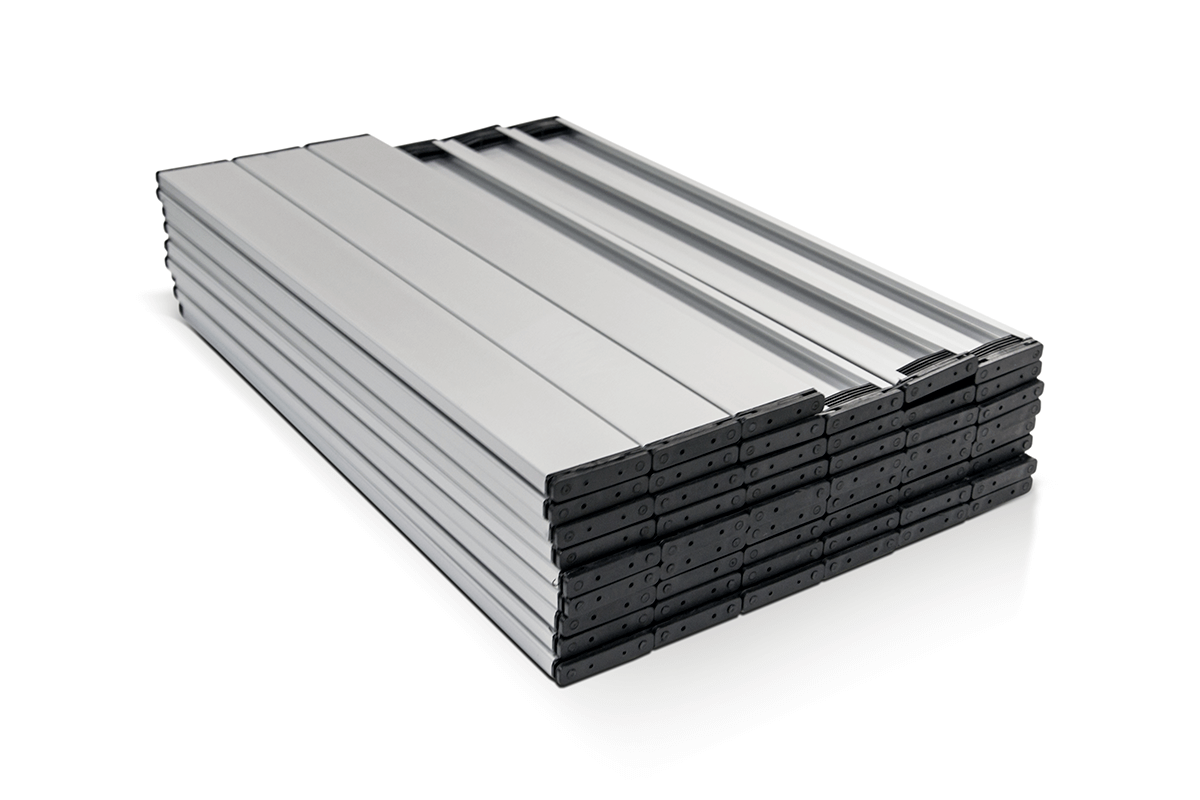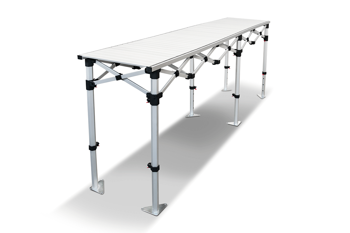 is a practical solution suunnittelued for convenient use at events, trade fairs, or outdoor presentations. Made of allow the entire set to fit into a handy carry bag with handles, making transport and storage easy. The tables are available in , the height of the table can be set at three levels, and each leg can also be adjusted individually to ensure stability on uneven surfaces.
