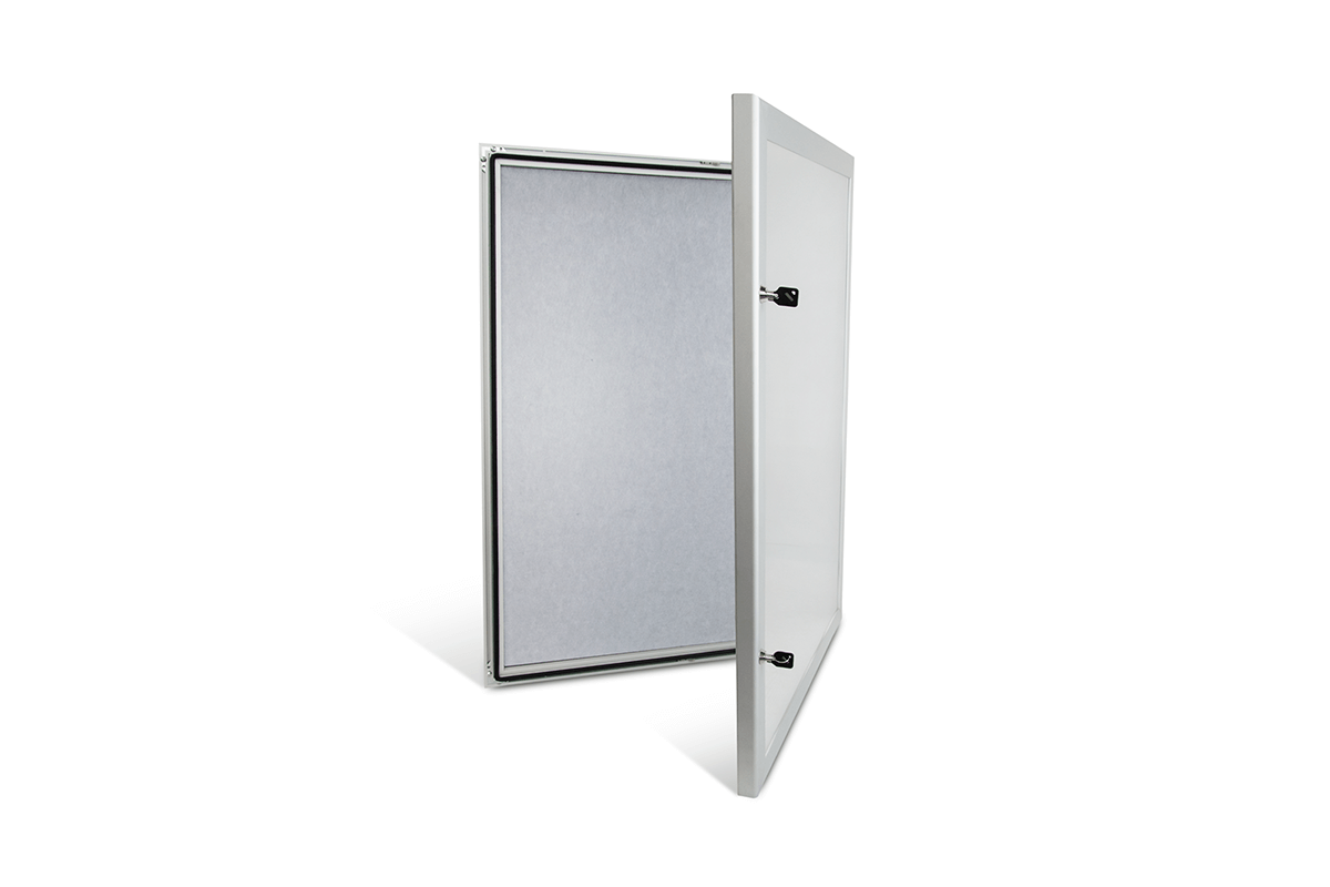 This notice board display case is suitable for both indoor and outdoor use and features a rear wall made of metal sheet covered with felt, allowing for easy pinning of announcements, photos, and informational materials using push pins. A small gap between the plexiglass front and the display surface allows for safe and neat placement of slightly raised items. The sturdy anodized aluminum frame ensures durability and corrosion resistance, while the clear plexiglass front provides excellent visibility and content protection. The case is lockable for added security and can be quickly and securely mounted to a wall.