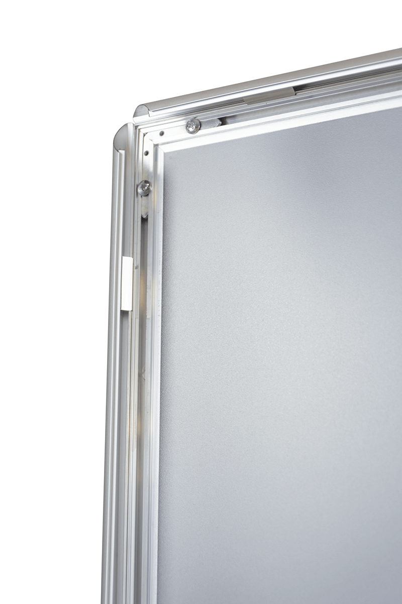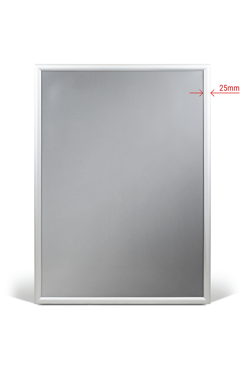 is a functional and visually appealing solution for displaying posters, announcements, and informational materials. Made from high-quality silver anodized aluminum, it features a 25 mm profile that ensures both a modern appearance and sturdy construction. The snap-open system allows for quick and easy content replacement without removing the frame from the wall. An anti-glare protective cover shields the graphic from light reflections and mechanical damage. The frame can be mounted in either portrait or landscape orientation, offering flexible installation options. Perfect for offices, retail spaces, public buildings, and any environment where professional presentation of content is essential.