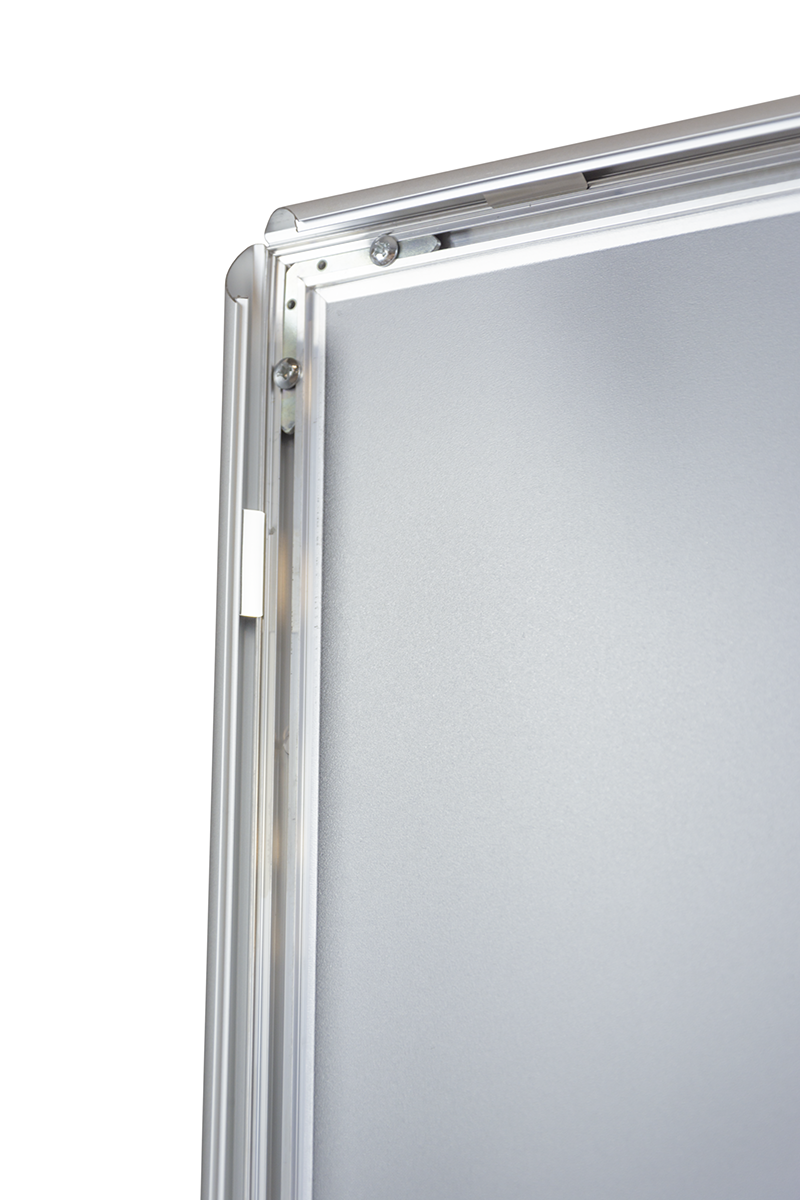 is an ideal solution for displaying promotional and informational materials in spaces where visibility from both sides is important. Made of high-quality silver anodized aluminum with a 25 mm profile, it combines elegant suunnittelu with durability and functionality. The snap-open system allows for quick and easy poster replacement on both sides, without removing the frame. Anti-glare protective covers shield the graphics from light reflections and mechanical damage. The frame is suitable for vertical or horizontal mounting, and can be suspended or installed on double-sided display structures. Perfect for shopping centers, storefronts, lobbies, trade shows, and any space where content needs to be visible from both sides.