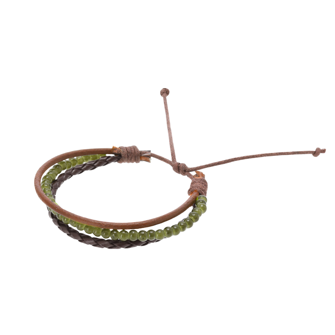 Erottuva trio-muotoilu: Rannekkeessa on yhdistetty sileä vaaleanruskea nahkanauha, teksturoitu punottu tummanruskea nahkanauha ja keskiosa, jota koristavat vaaleanvihreät lasihelmet.
