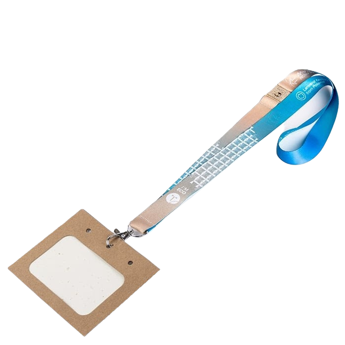 Kompletny zestaw ekologiczny: Zawiera smycz z recyklingowanego PET 100% i nadający się do recyklingu papierowe etui na identyfikator dla w pełni zrównoważonego rozwiązania.